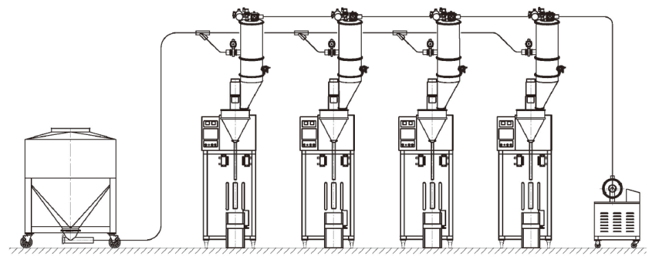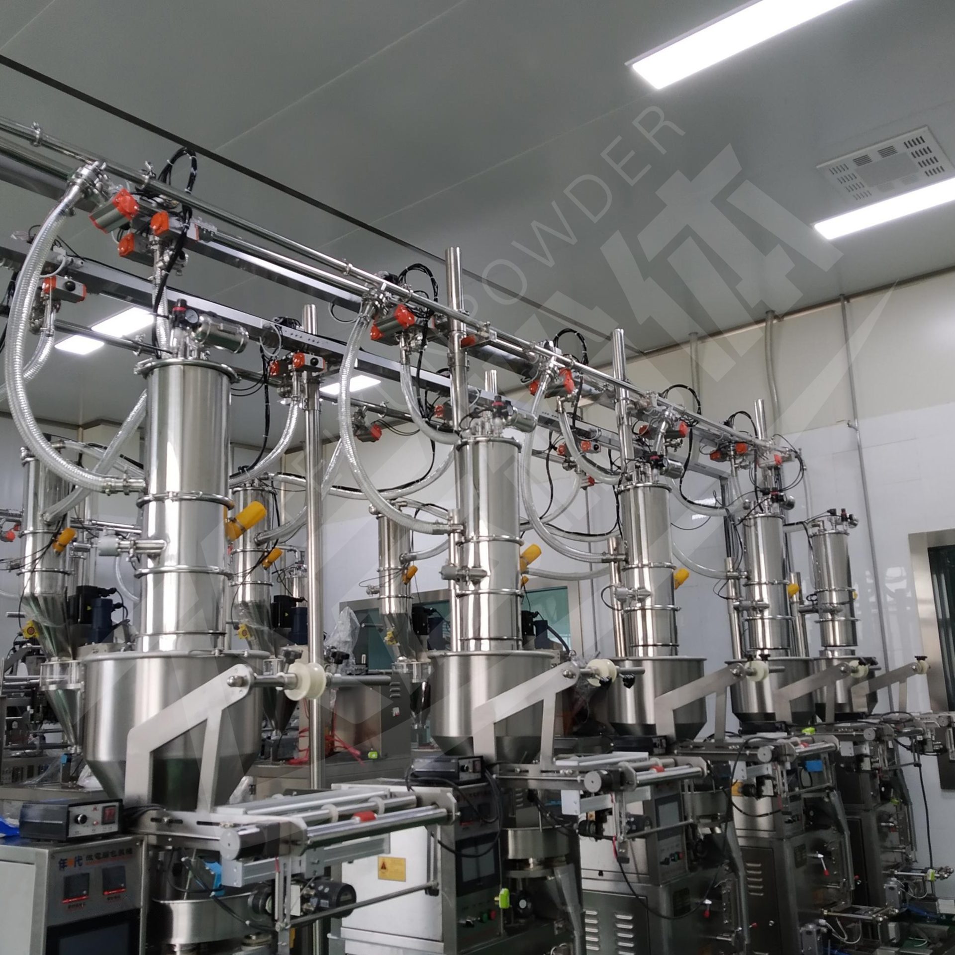 包装机集中供料系统由贮料仓、真空泵、若干个真空上料机料斗、管路系统、控制系统等组成,可完成由一个供料点向多台包装机集中供料,自动化程度高,无粉尘污染等优点,是制药厂、食品厂通过”GMP”认证,保持清洁、文明生产的设备。